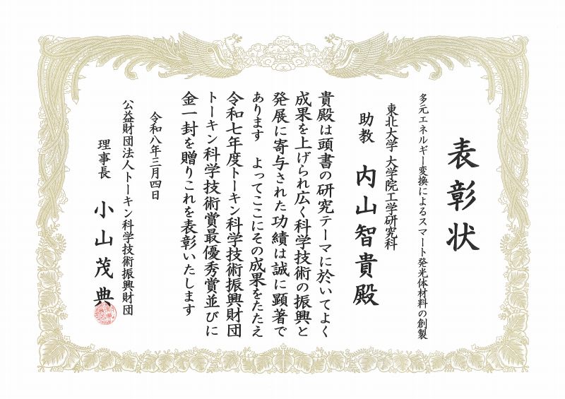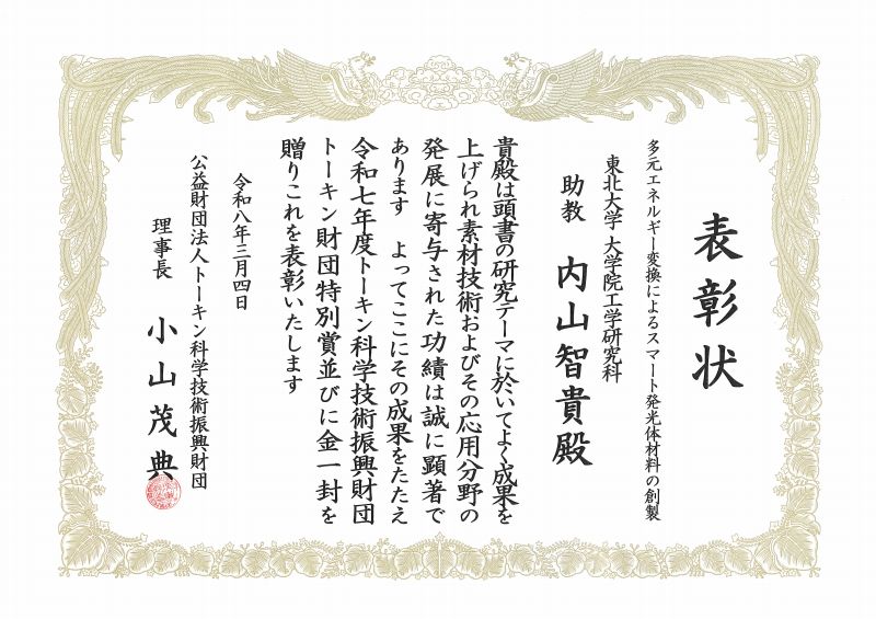 【受賞】内山 智貴助教が 第36回トーキン科学技術贈賞を受賞